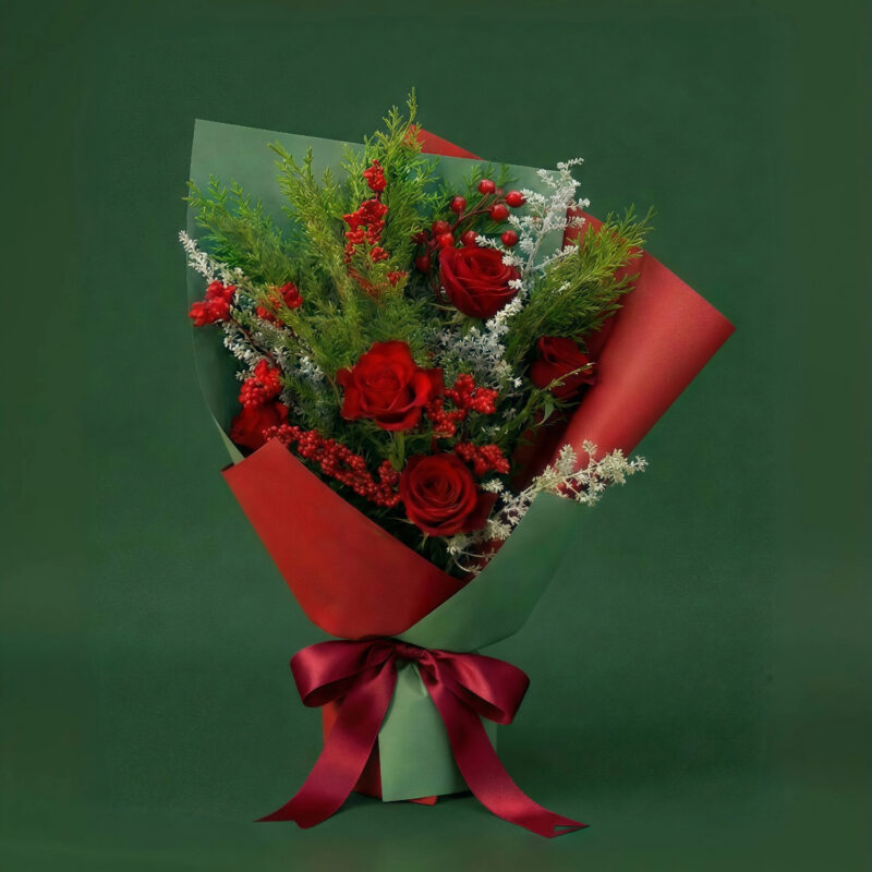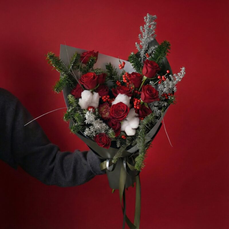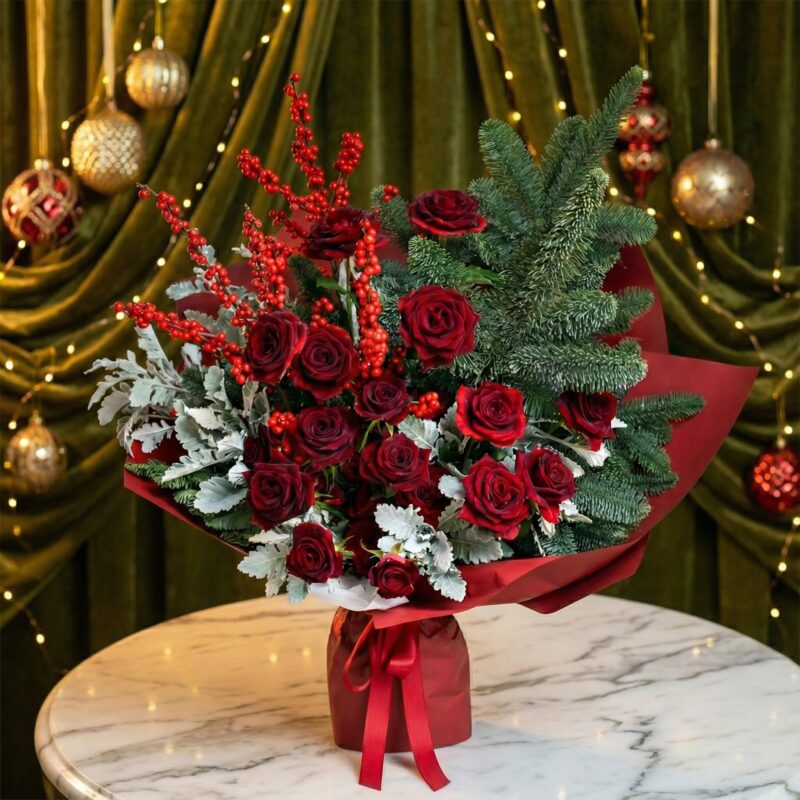 $60.00 – $80.00Price range: $60.00 through $80.002025 Artisan Christmas Bouquet: Roses, Noble Fir, Dusty Millers