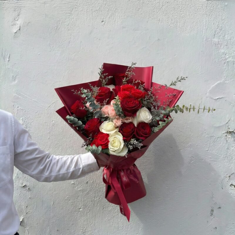 1. Juliette: A red, white, and pink bouquet made with roses, a timeless choice.