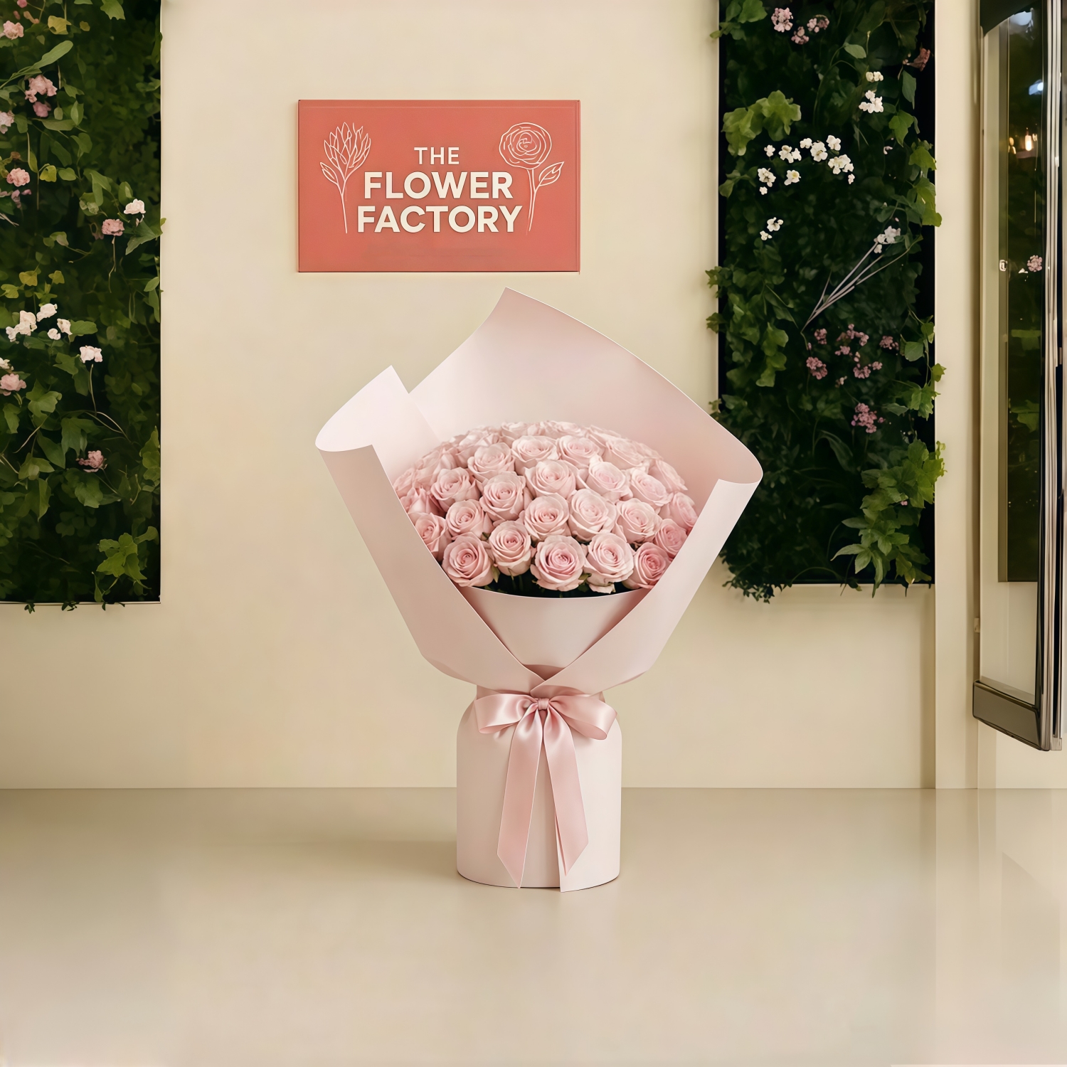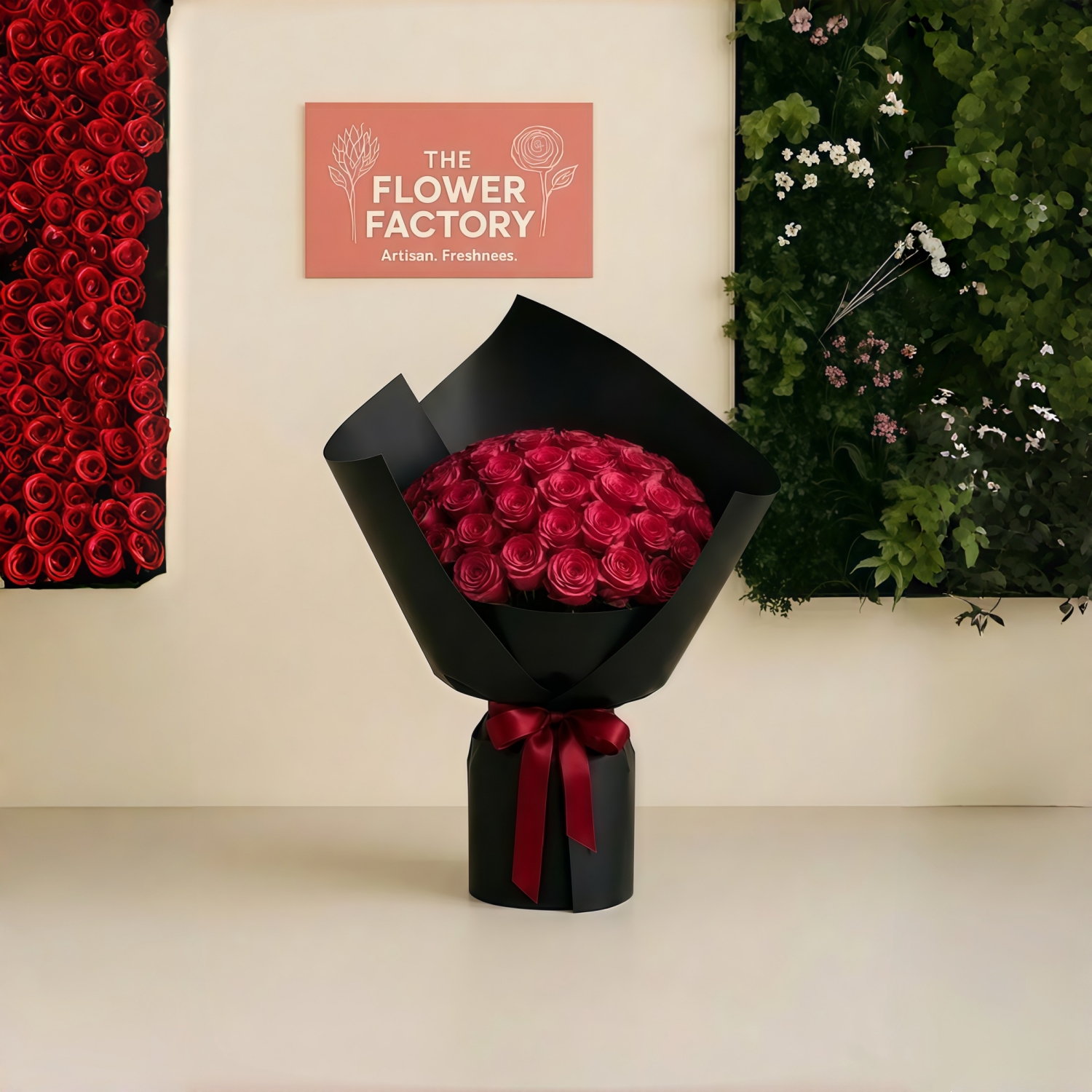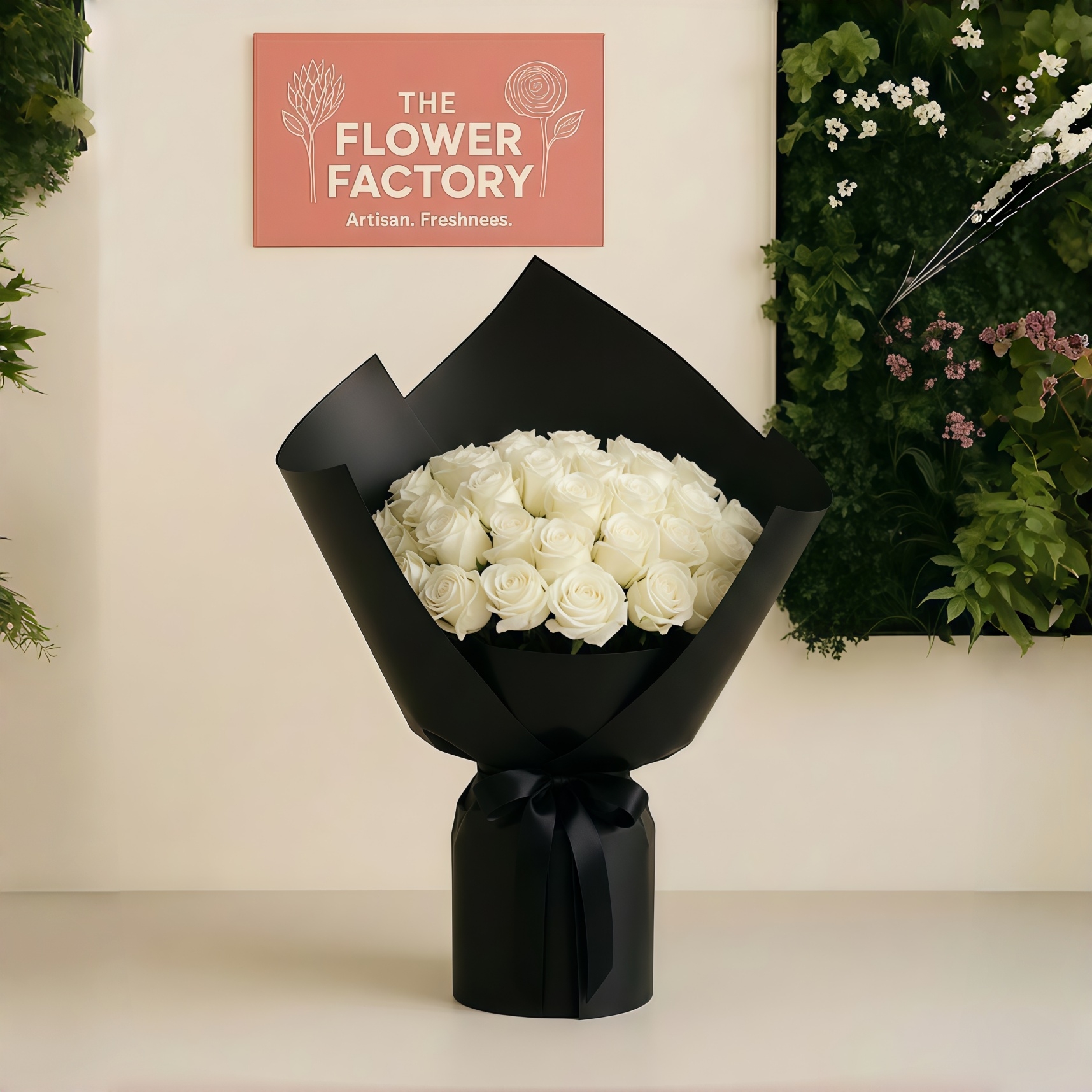 Remove all packaging and place the flowers in a clean vase filled with fresh water.