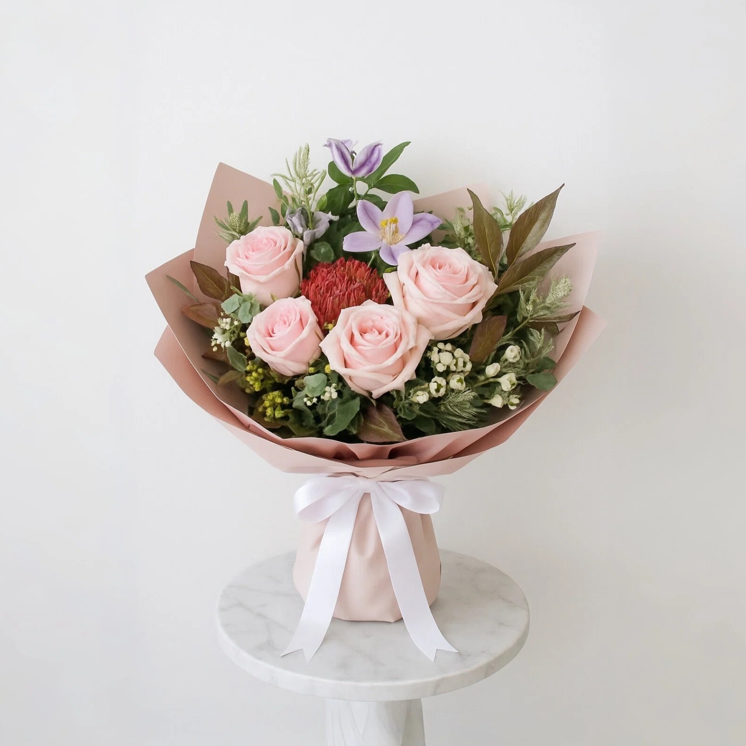 Soft, fragrant and utterly feminine, this bouquet blends the lush, ruffled petals of Pink Ohara roses -renowed for their old-world charm and delicate scent – with the sleek elegance of pink tulips. Together, they create a harmonious display of grace and romance in gentle shades of blush.