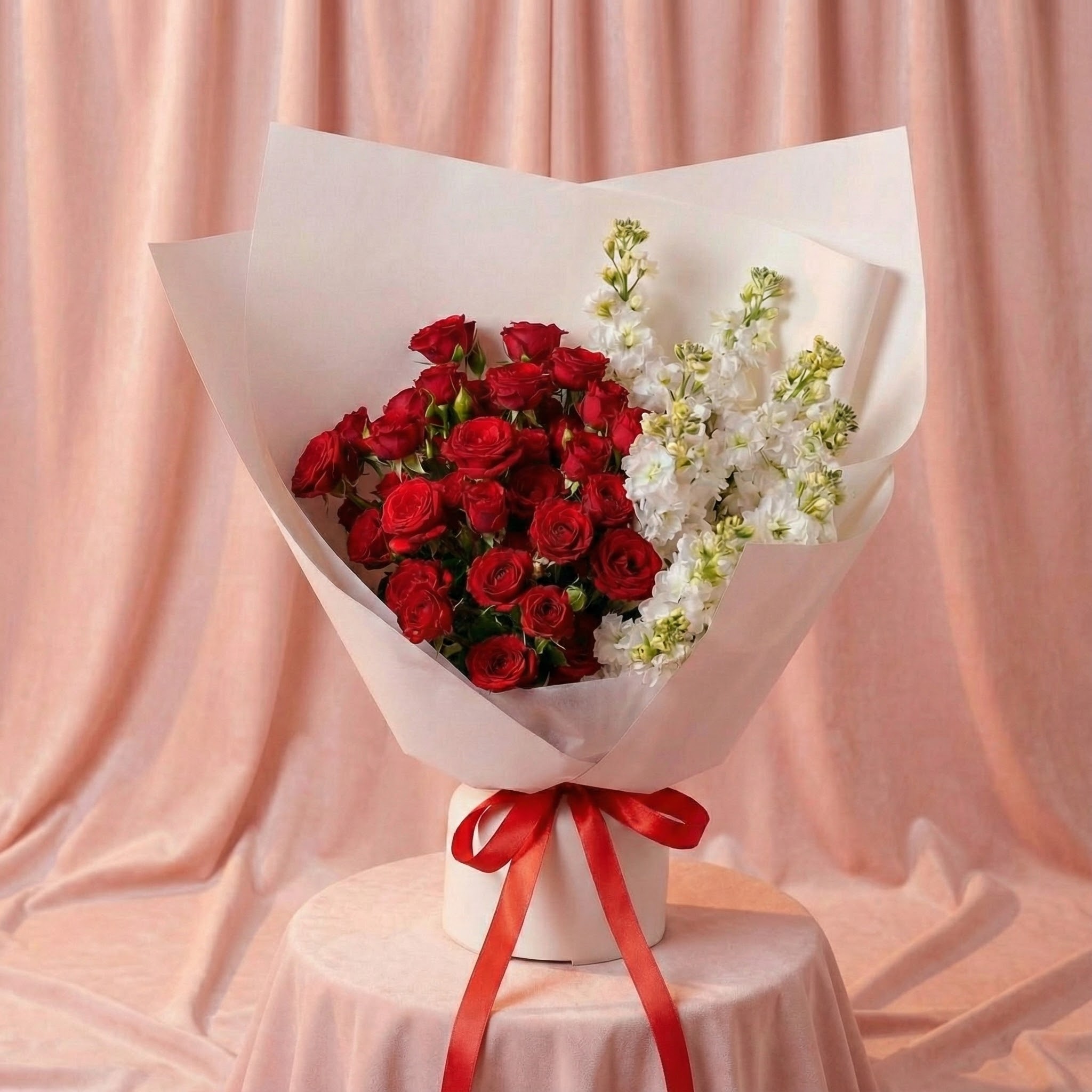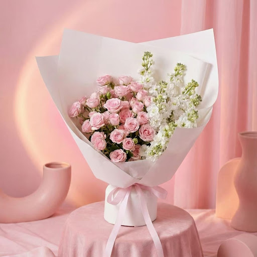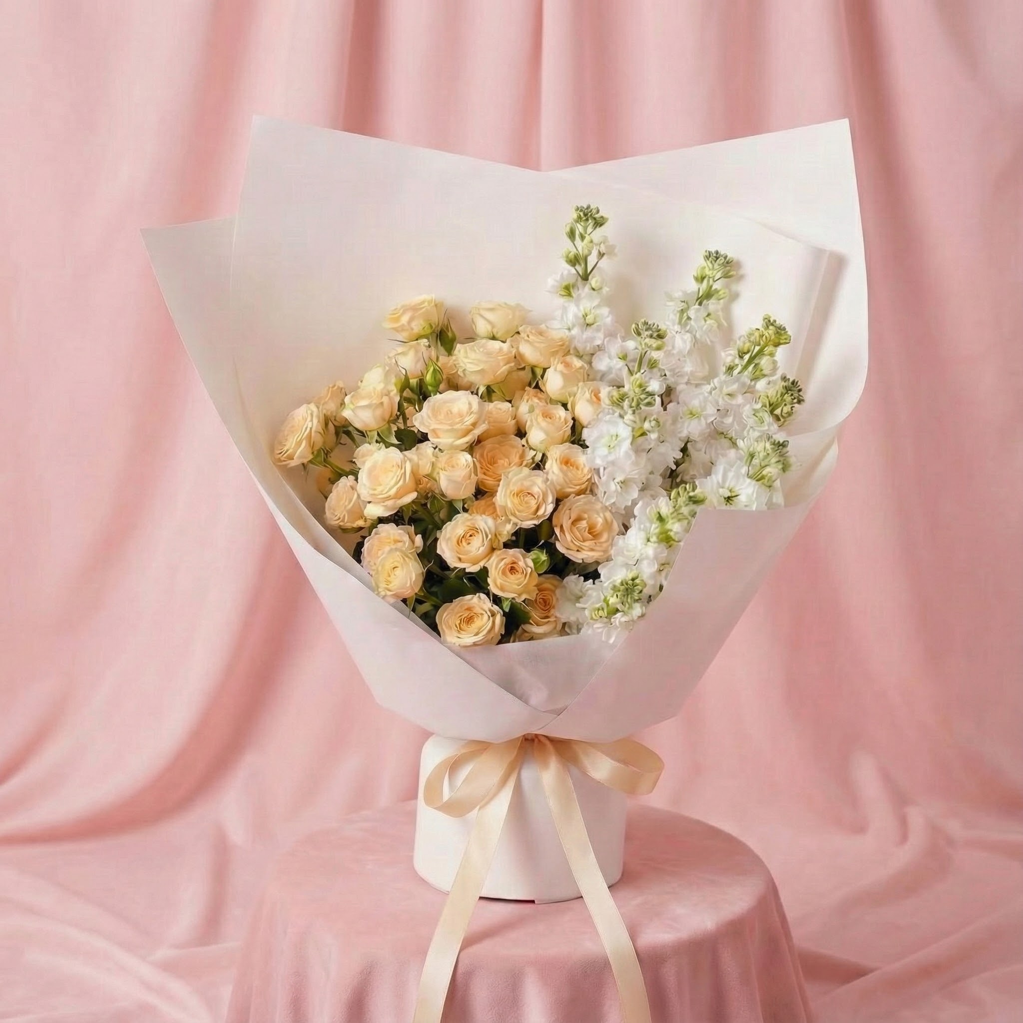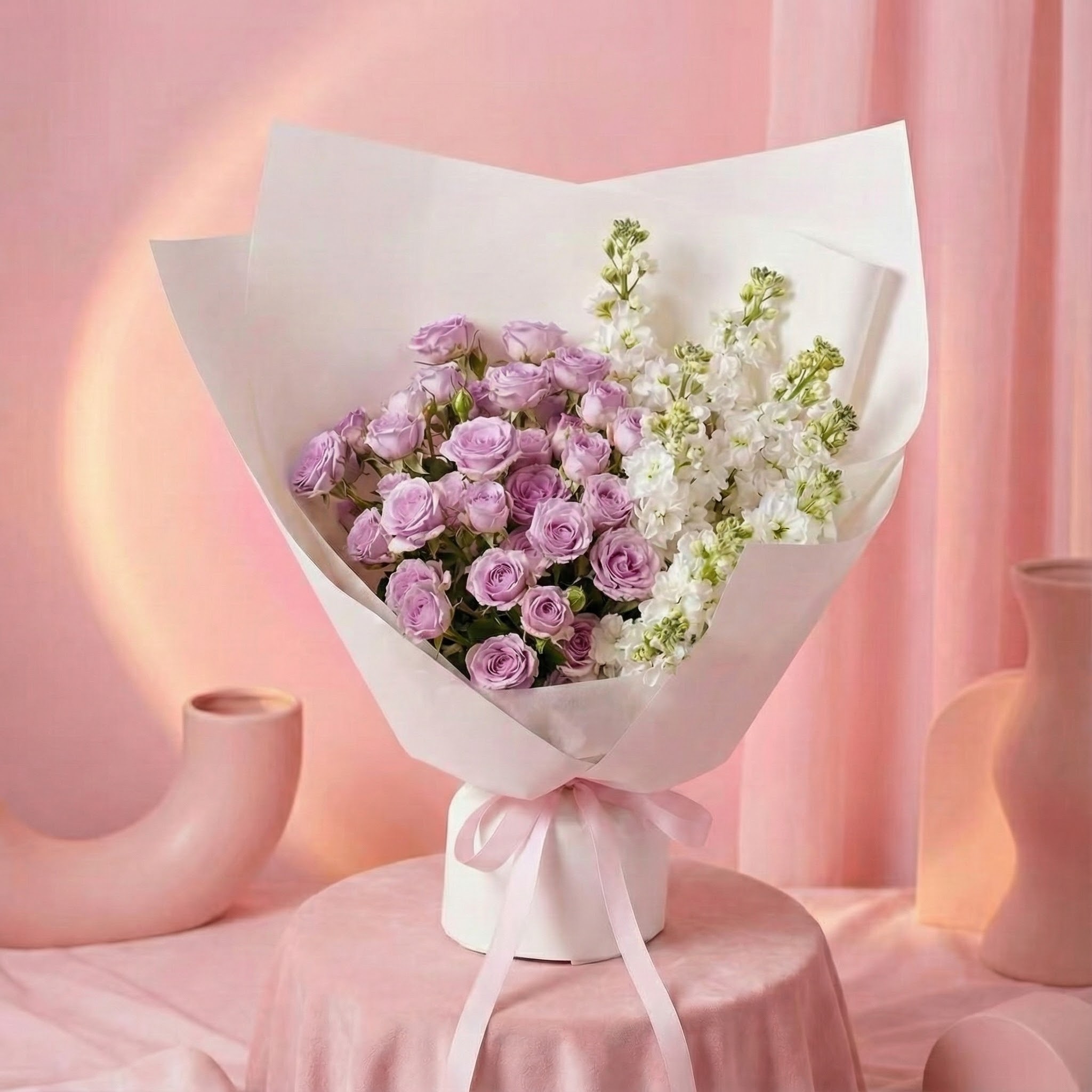 A lush pastel mix of spray roses/eustomas and white delphinium, wrapped in soft white for a sweet and romantic finish.