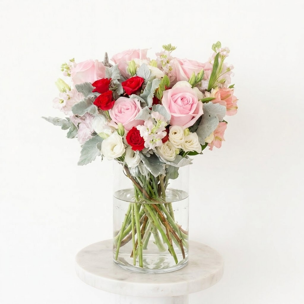 A charming and romantic bouquet blending soft elegance with bold passion. This arrangement features lush, sweet pink roses, known for their gentle beauty and delicate fragrance, nestled alongside fragrant sweet pink Matthiola. Vibrant red spray roses weave through the blush tones, offering a bold pop of colour.