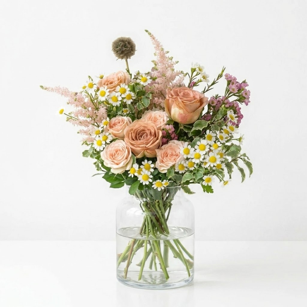 Made up of Cappuccino Roses, Tanacetum, Light Pink Spray Rose, Pink Wax Flower, Scabiosa Pod and Mini Pitto Leaves