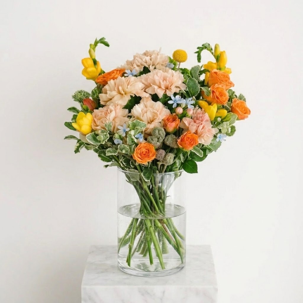 Made up of Caramel Carnations, Wax Flower, Yellow Freesia, Orange Spray Roses, Wax Flower, Blue Oxypetalum, Tanacetum, Pink Hypericum, Mini Pittosporum and Dusty Miller.