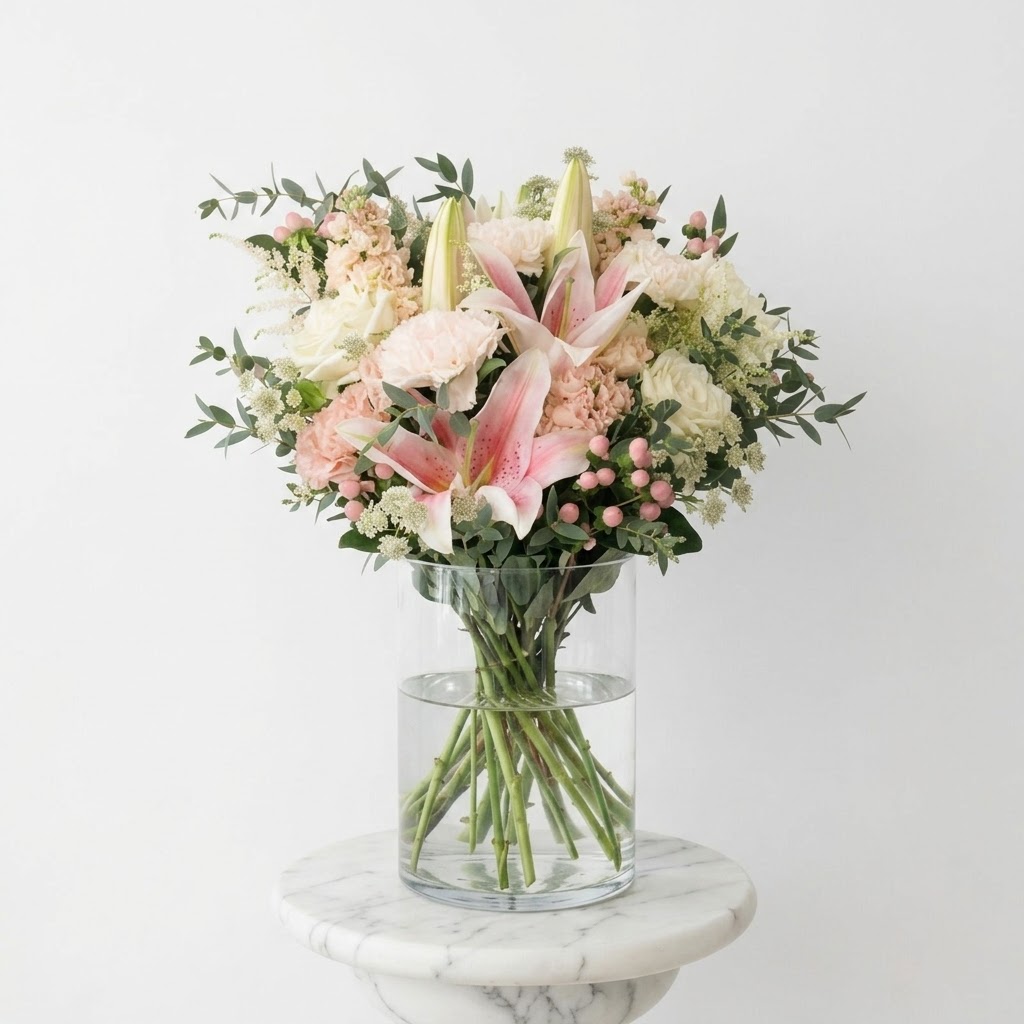 Made up of 3 Head Pink Lily, White Roses, Cream Carnations, Blush Mattiola, White Astrantria, Pink Hypericums, White Carnations and Eucalyptus Leaves.