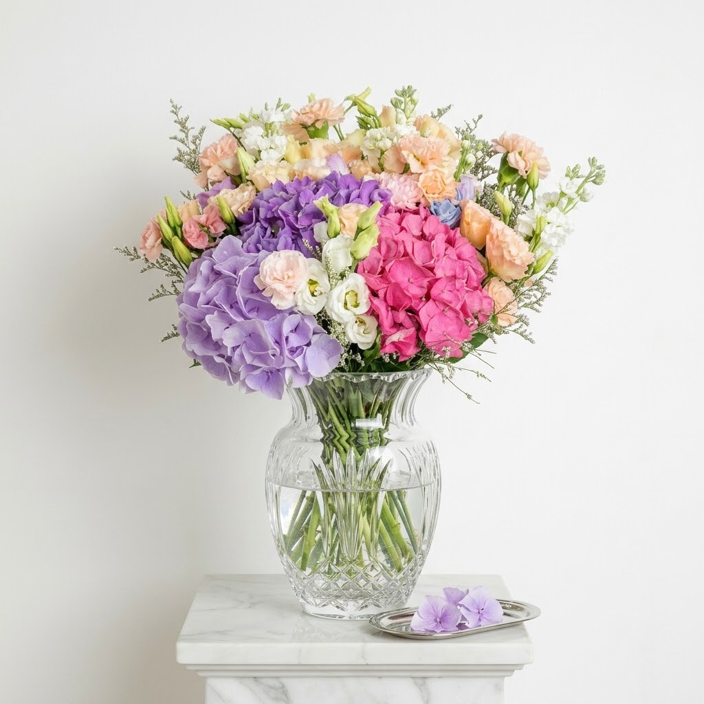 This bouquet features Pink Hydrangea, Lilac Hydrangea, Purple Hydrangea, Caramel Carnations, Champagne Eustomas, White Eustomas, White Mattiolas, cassia and Eucalytpus Leaves.
