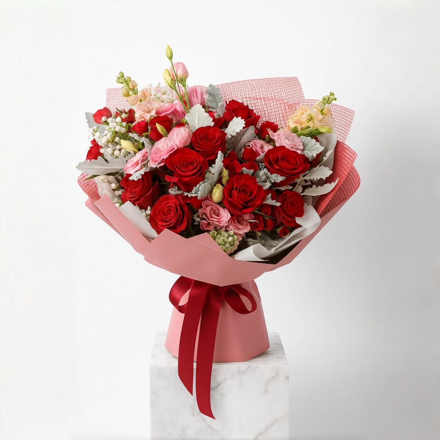 Made up of 12 Red Roses, Pink Eustomas, Champagne Mattiola, Red Spray Rose, Baby Breath and Dusty Miller