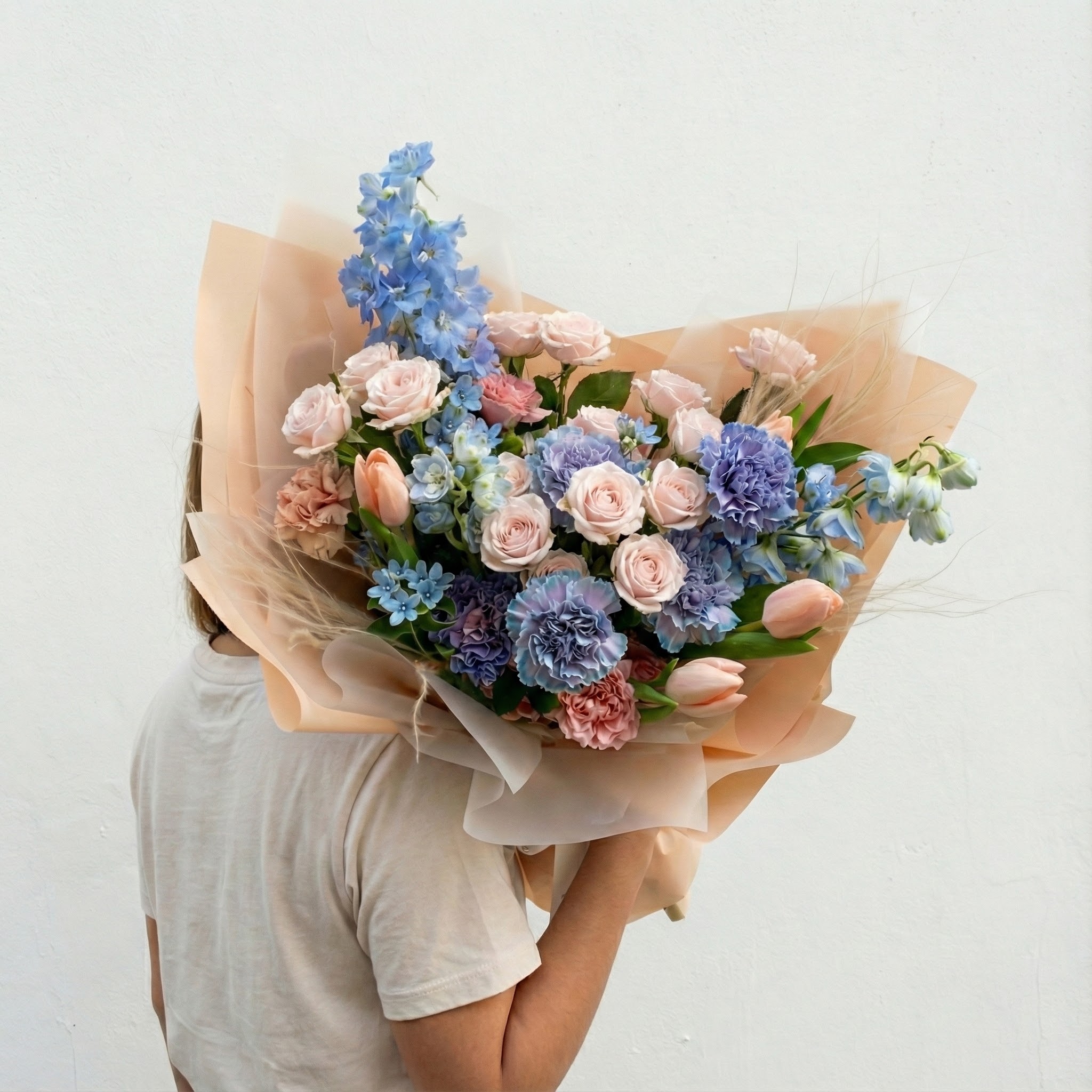 Sprayed and natural carnations; roses; tulips; delphiniums