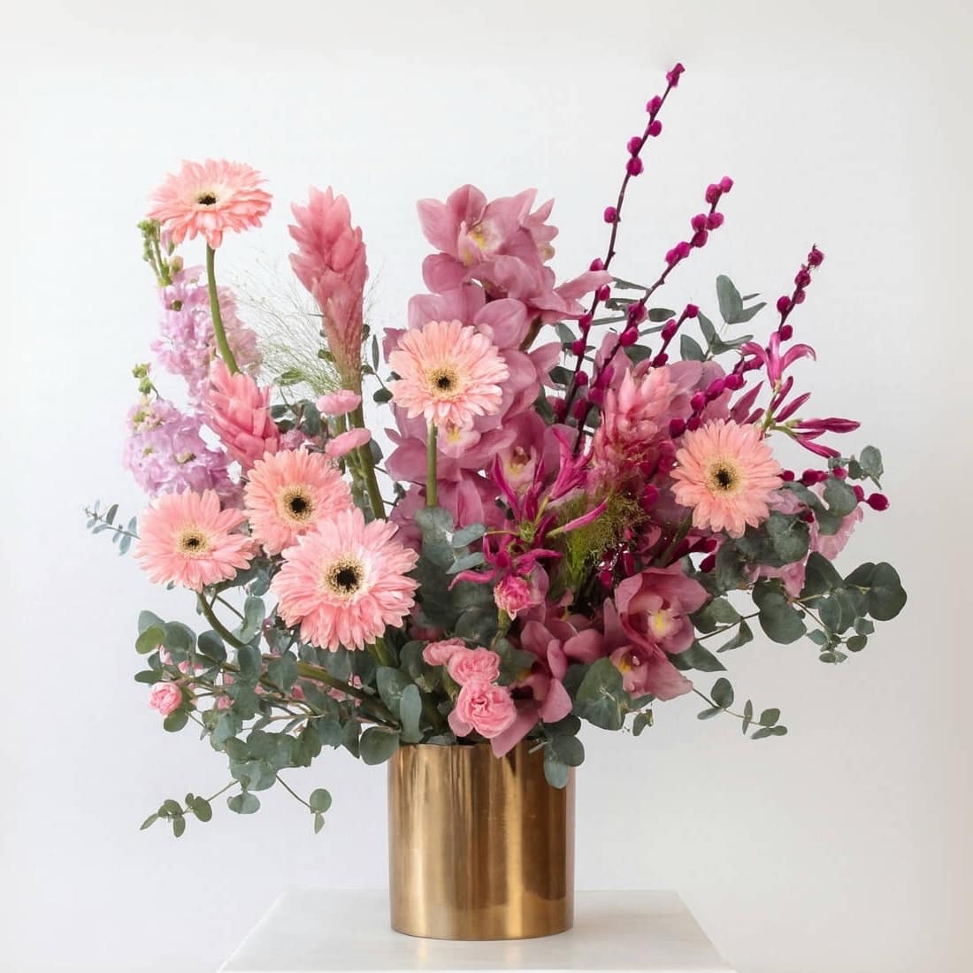 Made up of Pink Cymbidium, Pink Pussy Willow, Pink Ginger, Pink Mattiola, Pink Nerine, Pink Gerberas