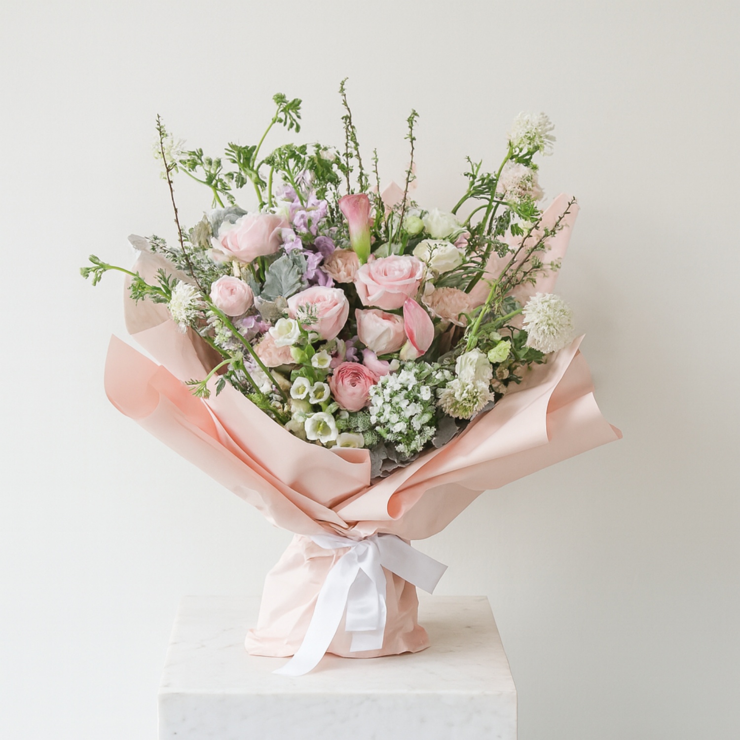 Made up of Pink Roses, Lilac Mattiola, White campanula, Pink Ranunculus (seasonal and will replace with pink tulip if not available), Didicus, Clementis, White Scabiosa, Pink Carnation, White Eustoma, Spirea, White Wax Flowers, Dusty Miller, White Sweet William