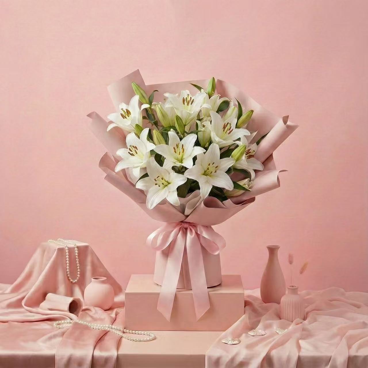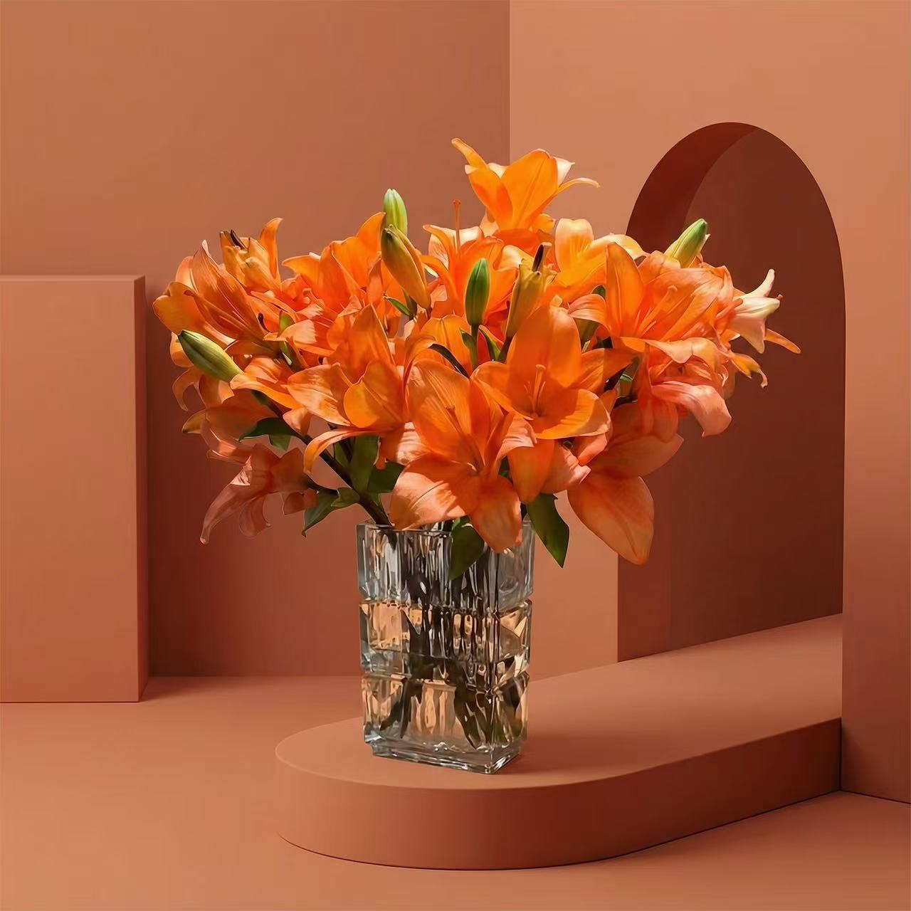 Remove all packaging and place the flowers in a clean vase filled with fresh water.