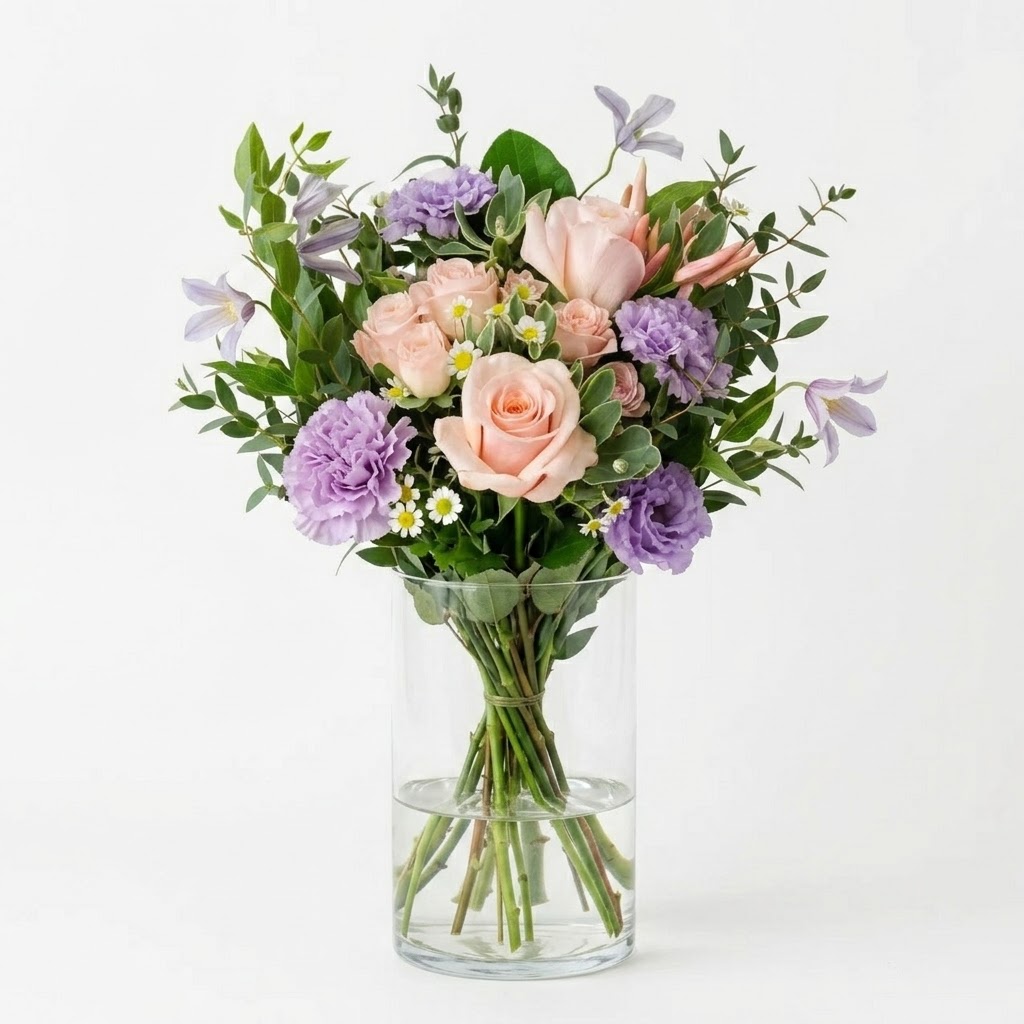 Made up of Mother of Pearl Roses, Lilac Carnations, Clematis, Tanacetums, Pink Spray Roses, Pink Nerine (seasonal), Euphorbia and Eucalyptus Leaves