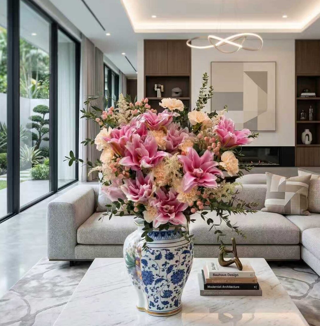 Flowers: Double petal lilies, carnations, hypericum, astilbe.