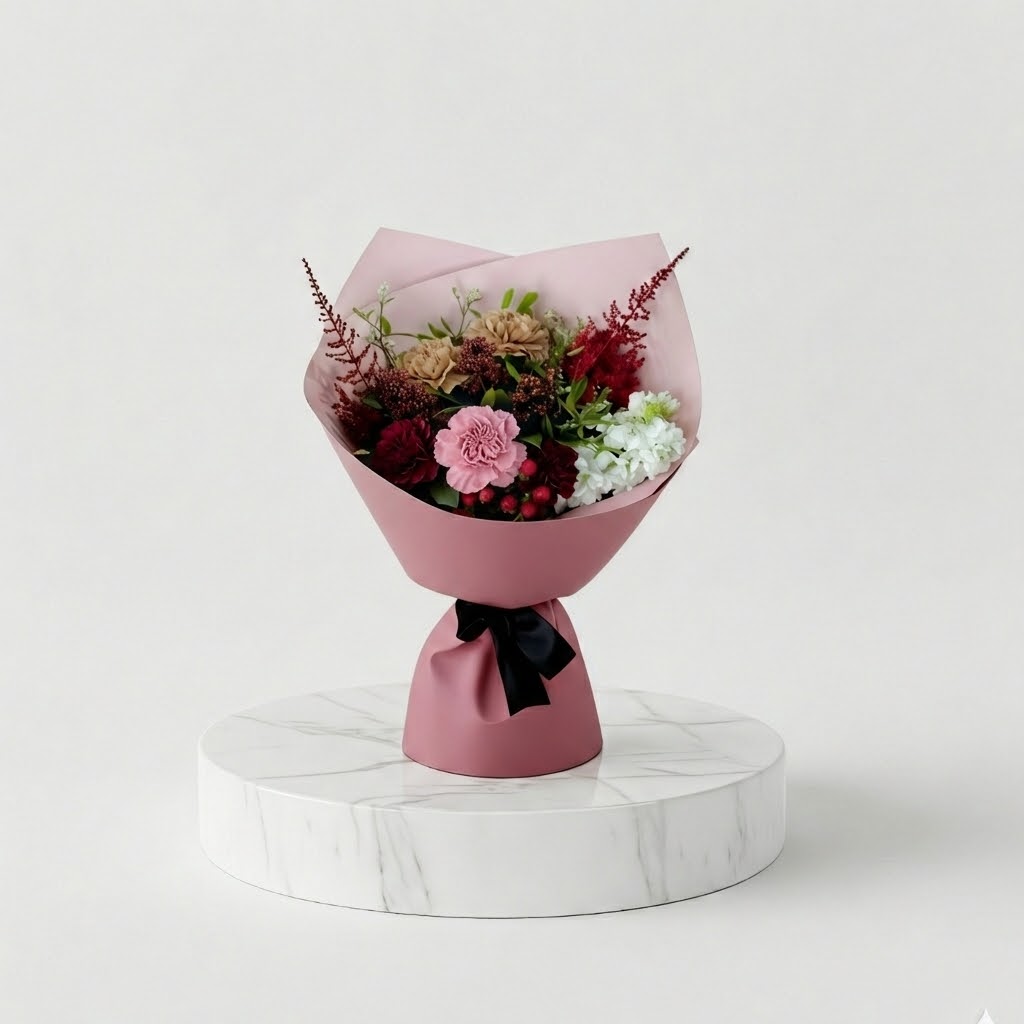 This bouquet features Caramel Carnations, White Mattiola, Red Skimma, Pink Spray Carnations, Red Hypericum, Caspia and Pistachio Leaves
