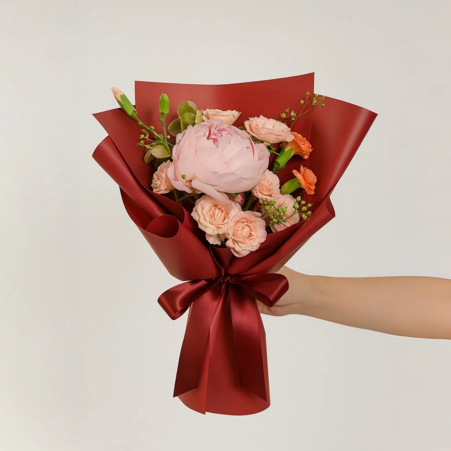 Made up of Sarah Bernhardt peony, Reflex Pink Spray Roses, Peach Spray Carnations, Green Hellebores and Eucalyptus Seeds
