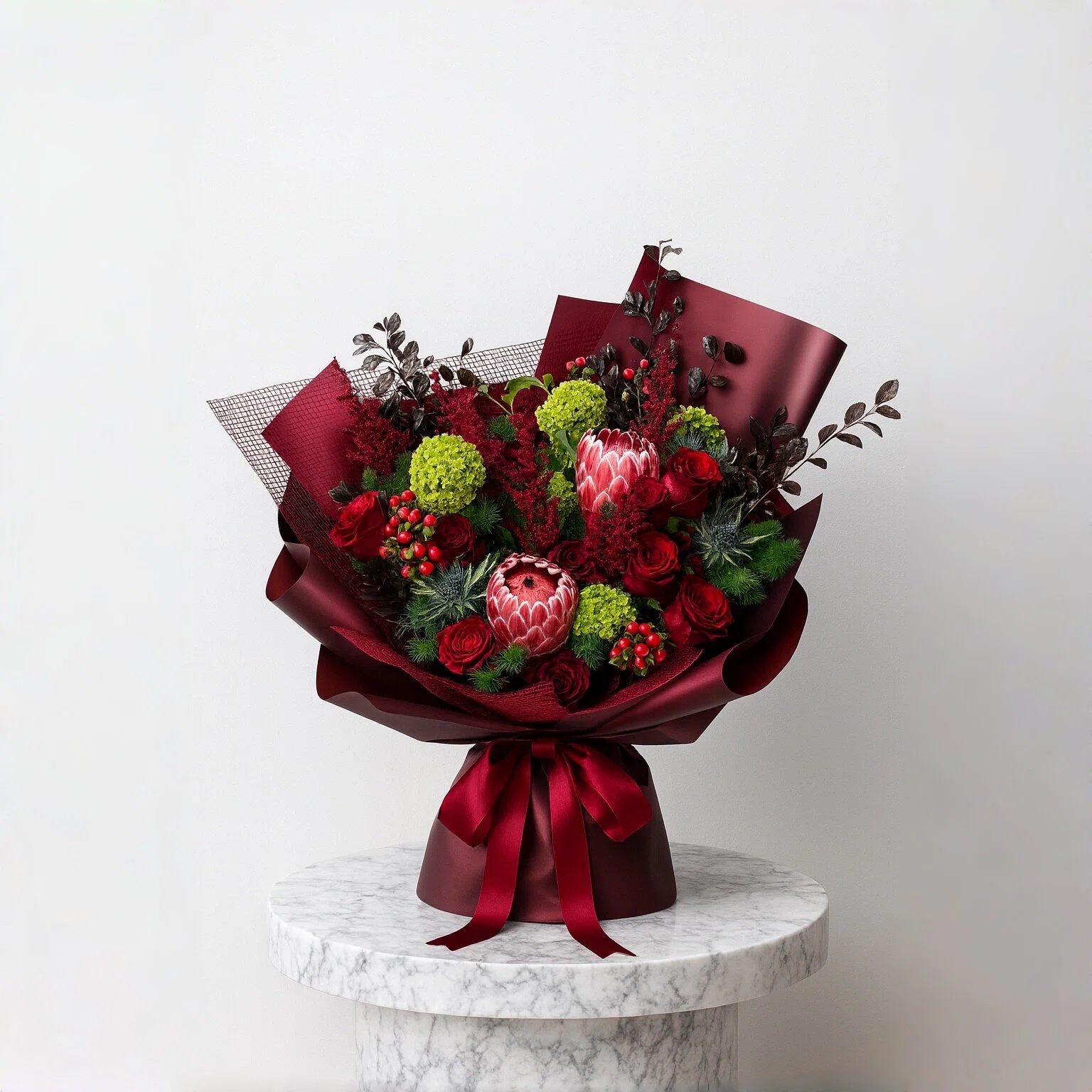 A breathtaking harmony of bold elegance and natural grace, this grand bouquet features the dramatic allure of red proteas, the timeless romance of deep red roses and the refreshing softness of flowy green snowball viburnum. Thoughtfully arranged to create a lush, sculptural silhouette – where fiery hues meet verdant textures, making a striking statement of passion, strength, and refined beauty.