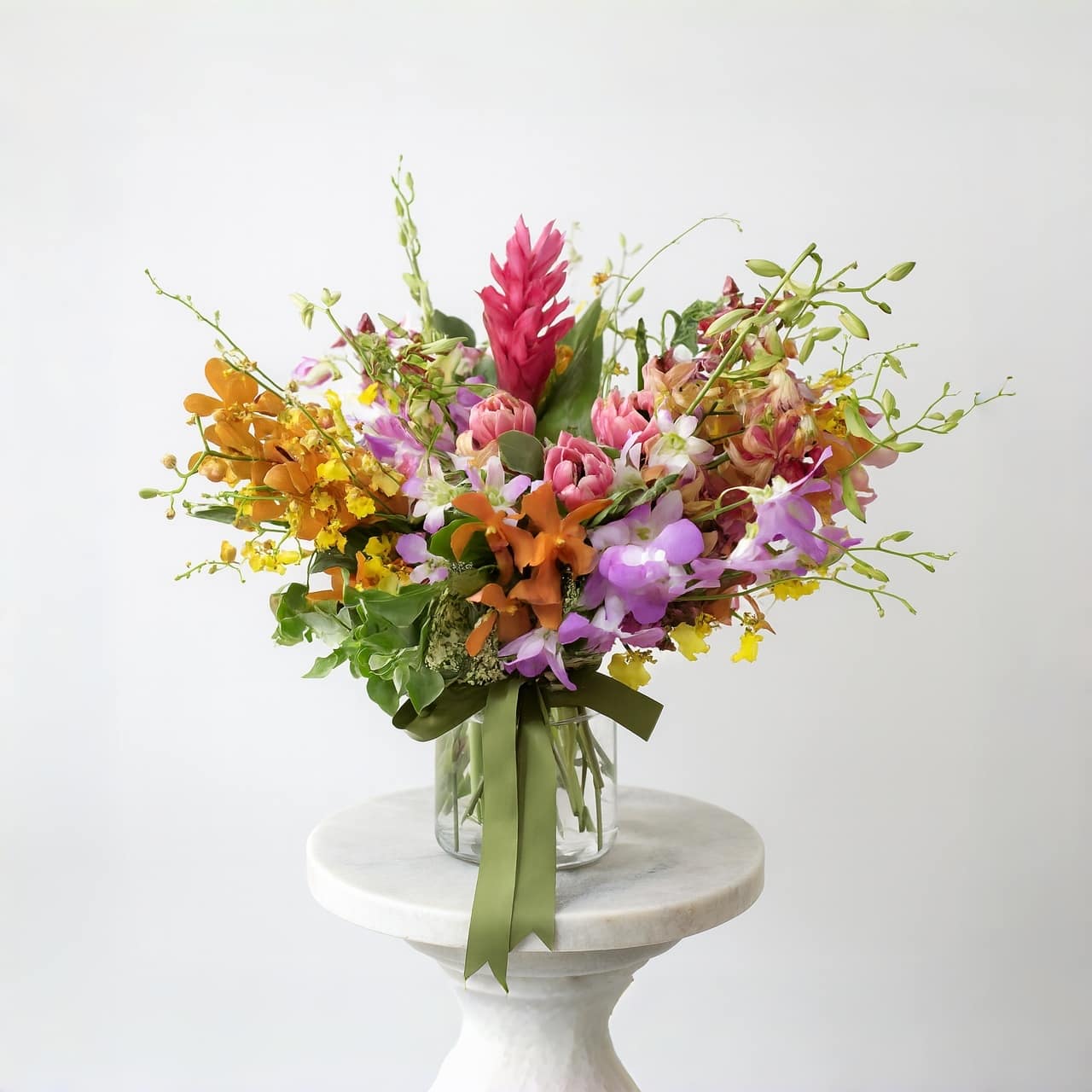 Tropicals fresh from the farms, with the market’s freshest seasonal flowers. Our Seasonal Farmer’s Mix in Statement Vase is the perfect centrepiece for your table.