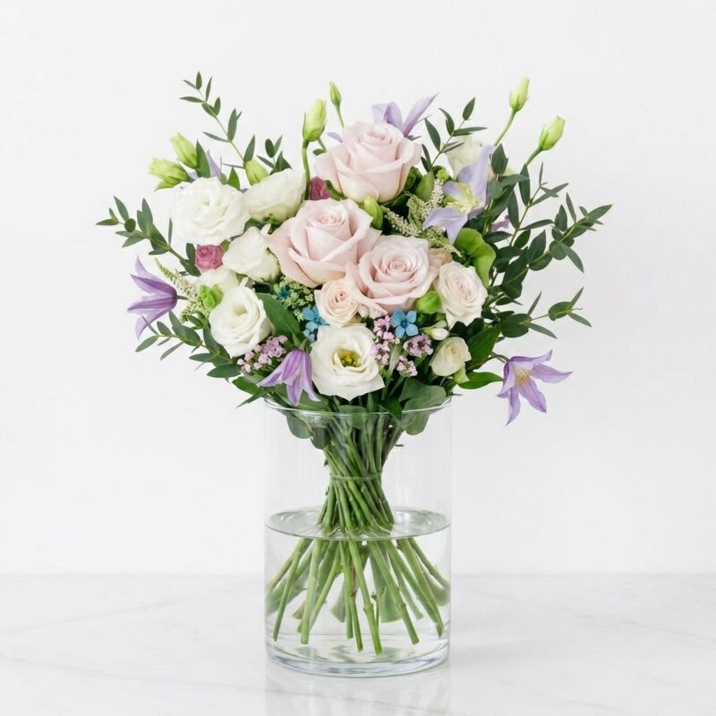 Made up of Menta Roses, Cream Spray Roses, White Eustomas, Clematis, Oxypetalum, Pink Wax Flower and Eucalyptus Leaves