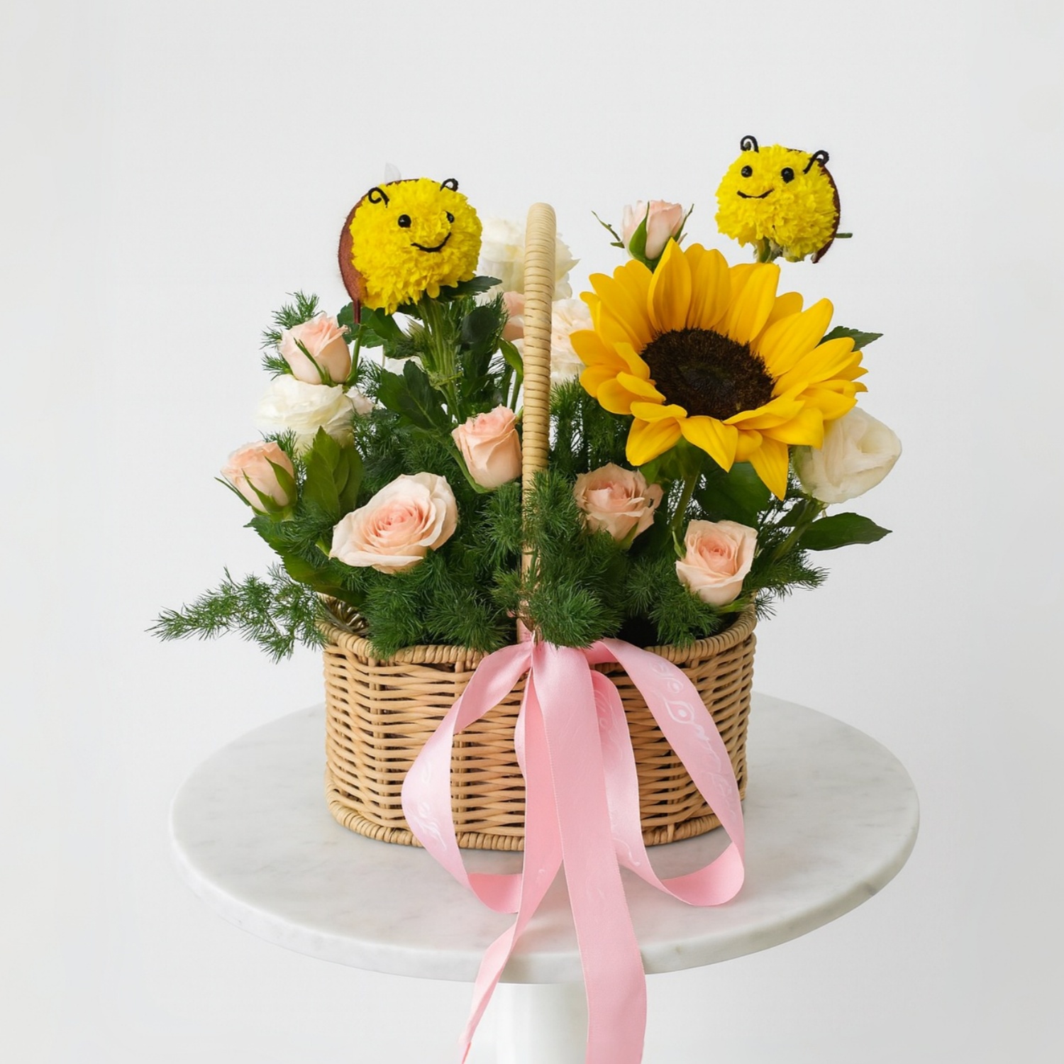 Send sunshine and smiles with this vibrant “Sunshine Hugs” basket! Bursting with radiant sunflower, honeybees, pink spray rose, white Eustoma and seated around Ming Fern, this heartfelt arrangement is designed to lift spirits and bring comfort.