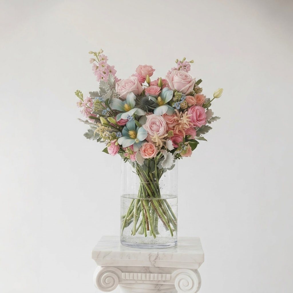 A striking blend of soft romance and cool elegance, this bouquet pairs the rare beauty of blue tulips with the timeless charm of light pink roses.
