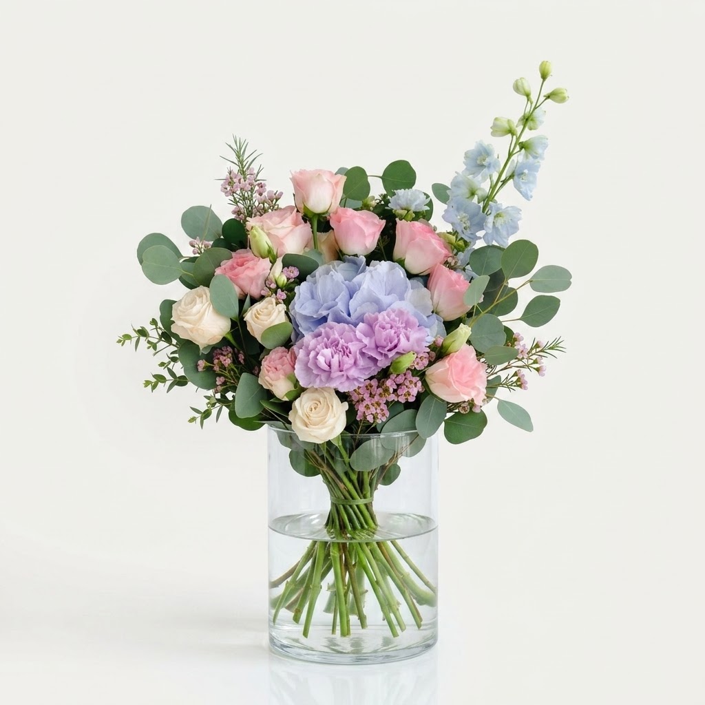 由浅蓝色绣球花、淡紫色康乃馨、粉色秋海棠、浅蓝色飞燕草、奶油色多头玫瑰、粉色蜡花及桉树叶组成。