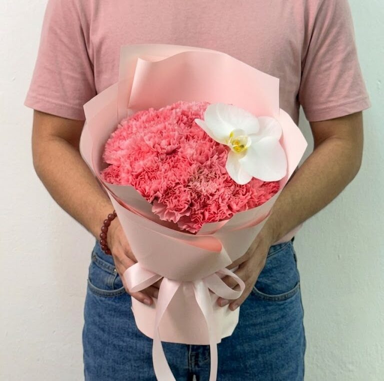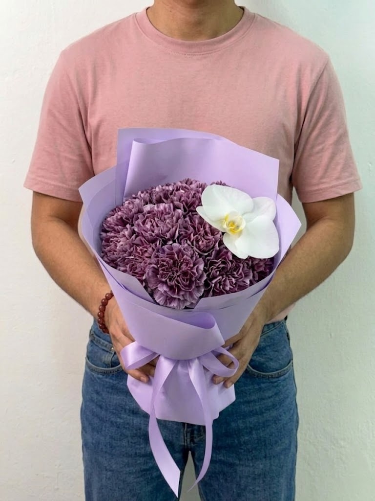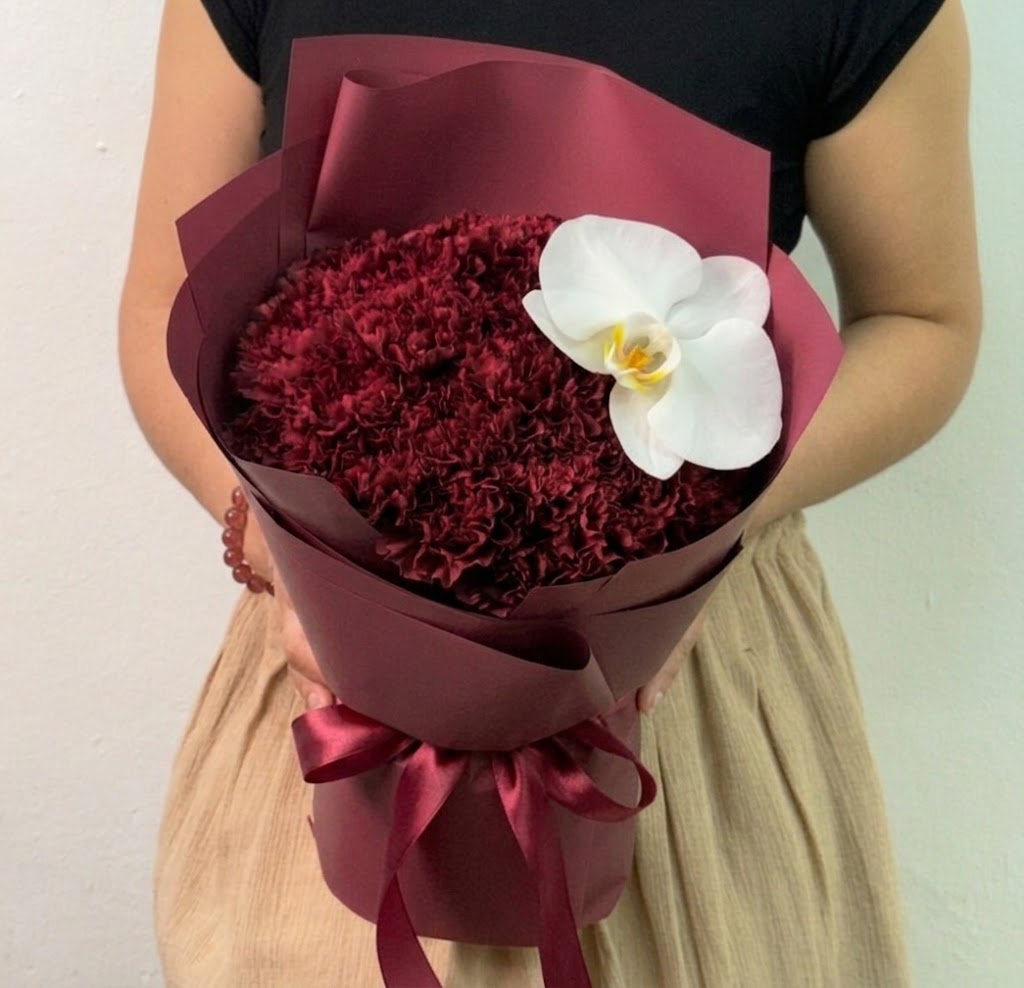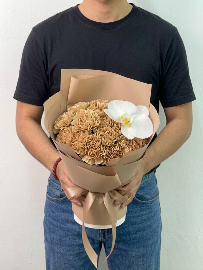 匠心之作:24支康乃馨搭配白色兰花;圆形包装花束或花瓶插花