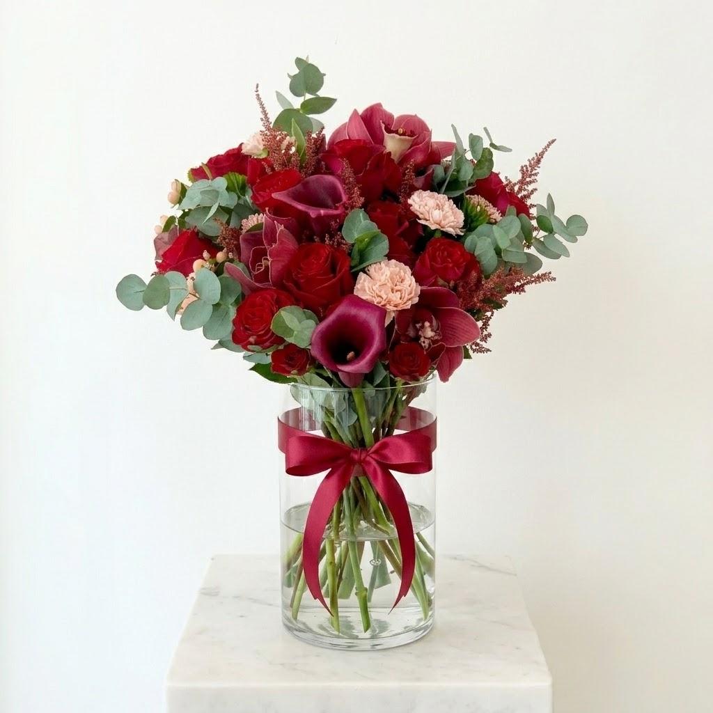 这款惊艳的花束大胆而奢华,深红与皇家紫交织成一曲炽热情诗。天鹅绒般的红玫瑰奠定永恒浪漫基调,紫色马蹄莲则点缀出流畅优雅与现代魅惑。